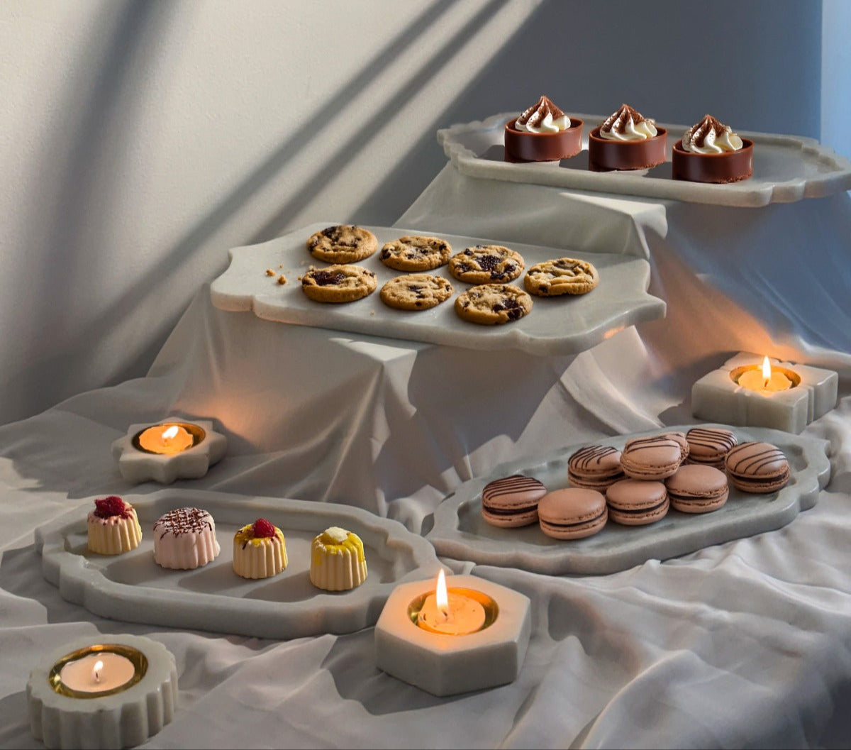 Home, elevated. A collection of handcrafted marble pieces - trays, cake stands, photo frames, trinket boxes, and more - each a testament to timeless artistry.