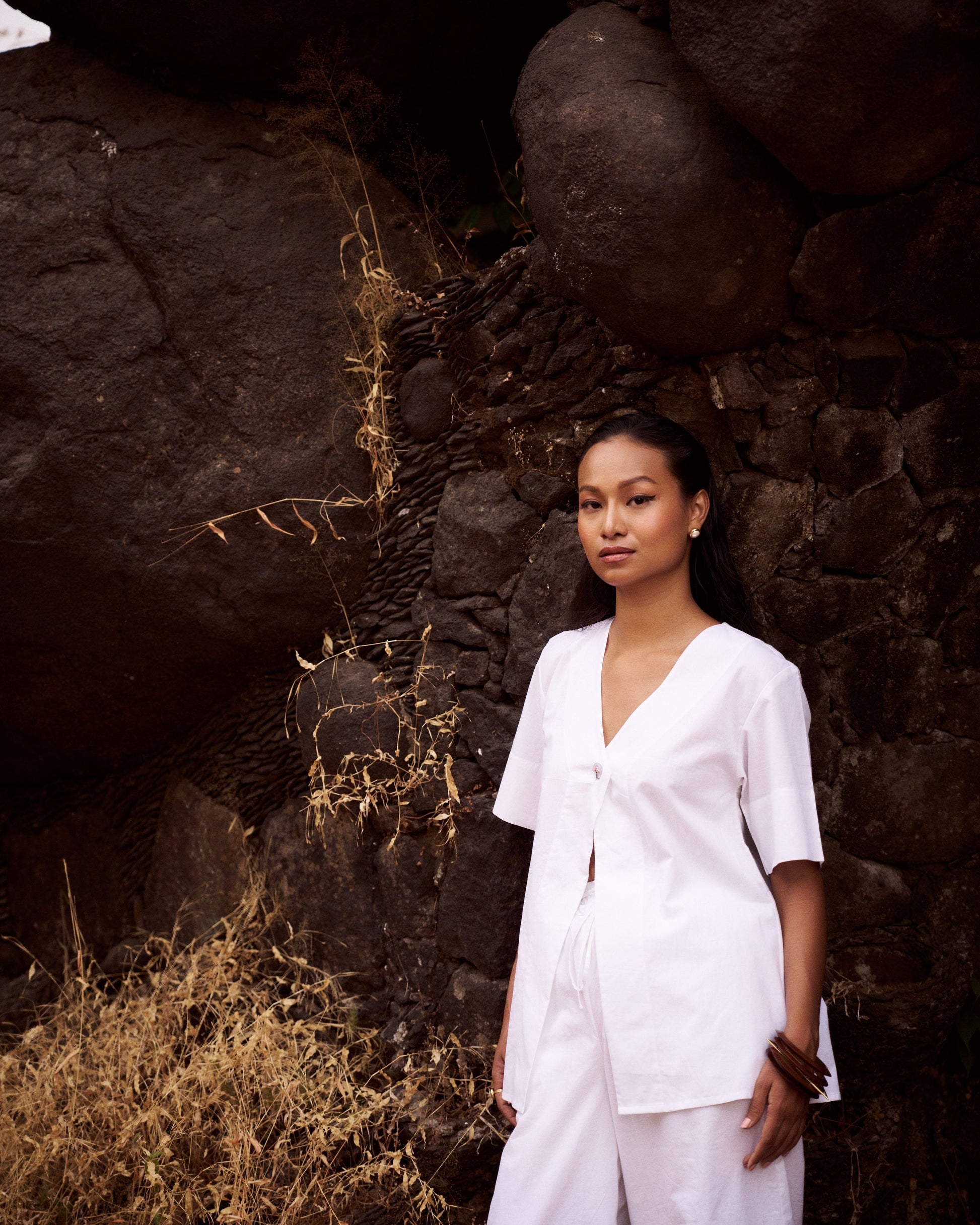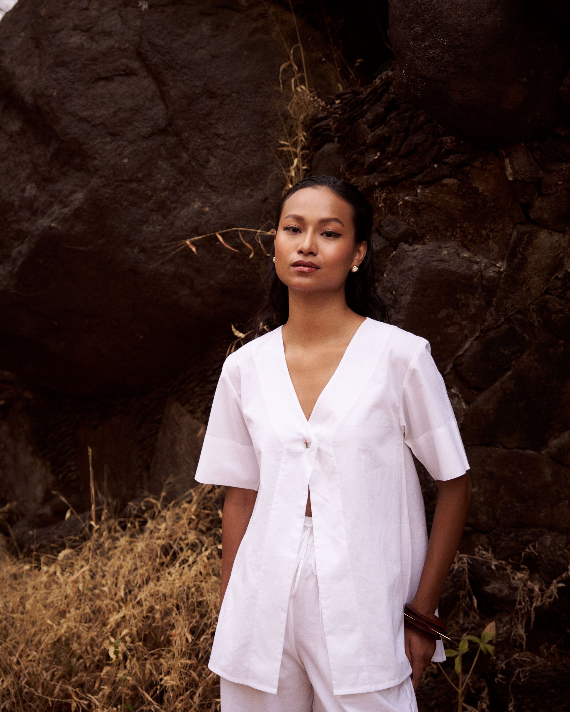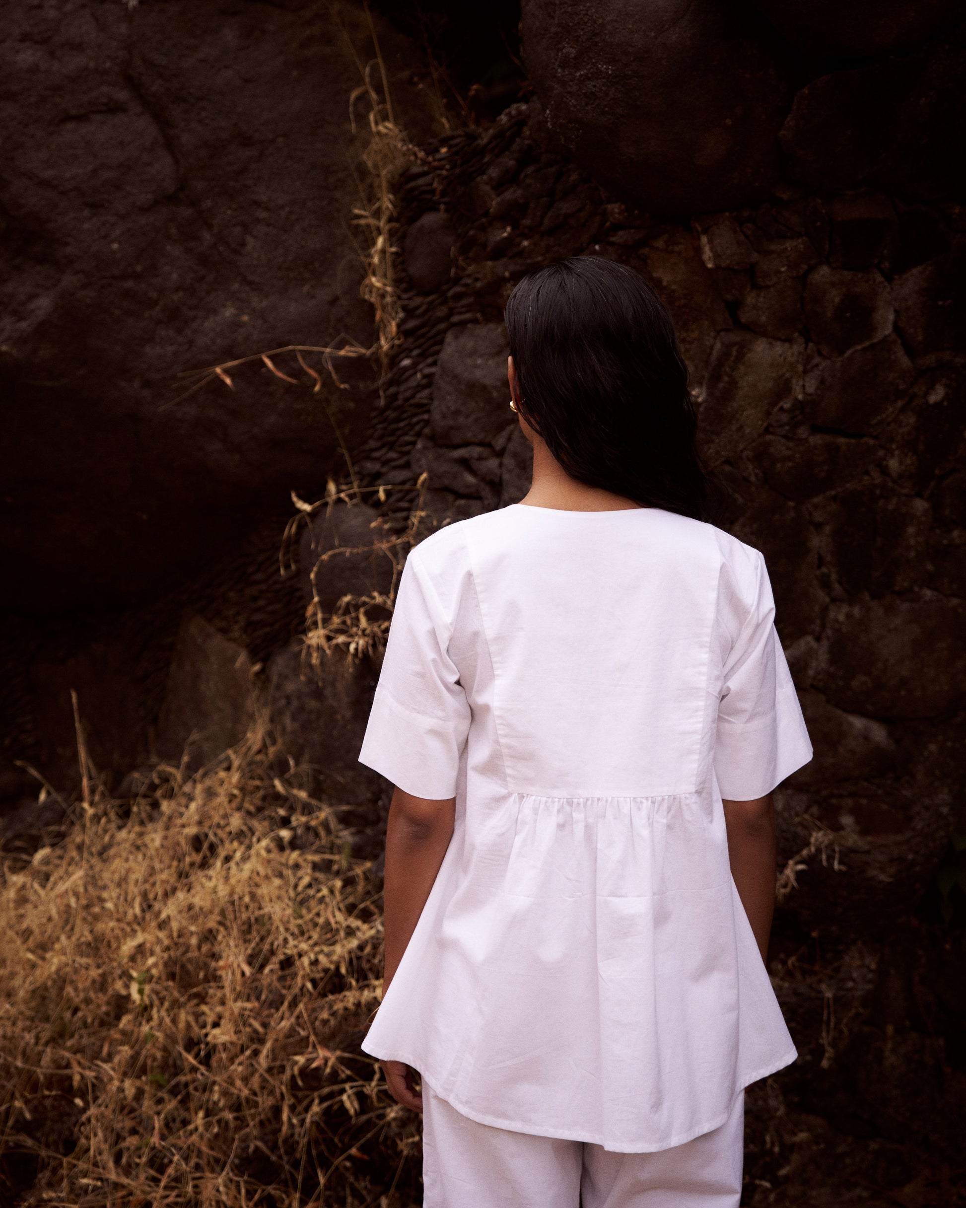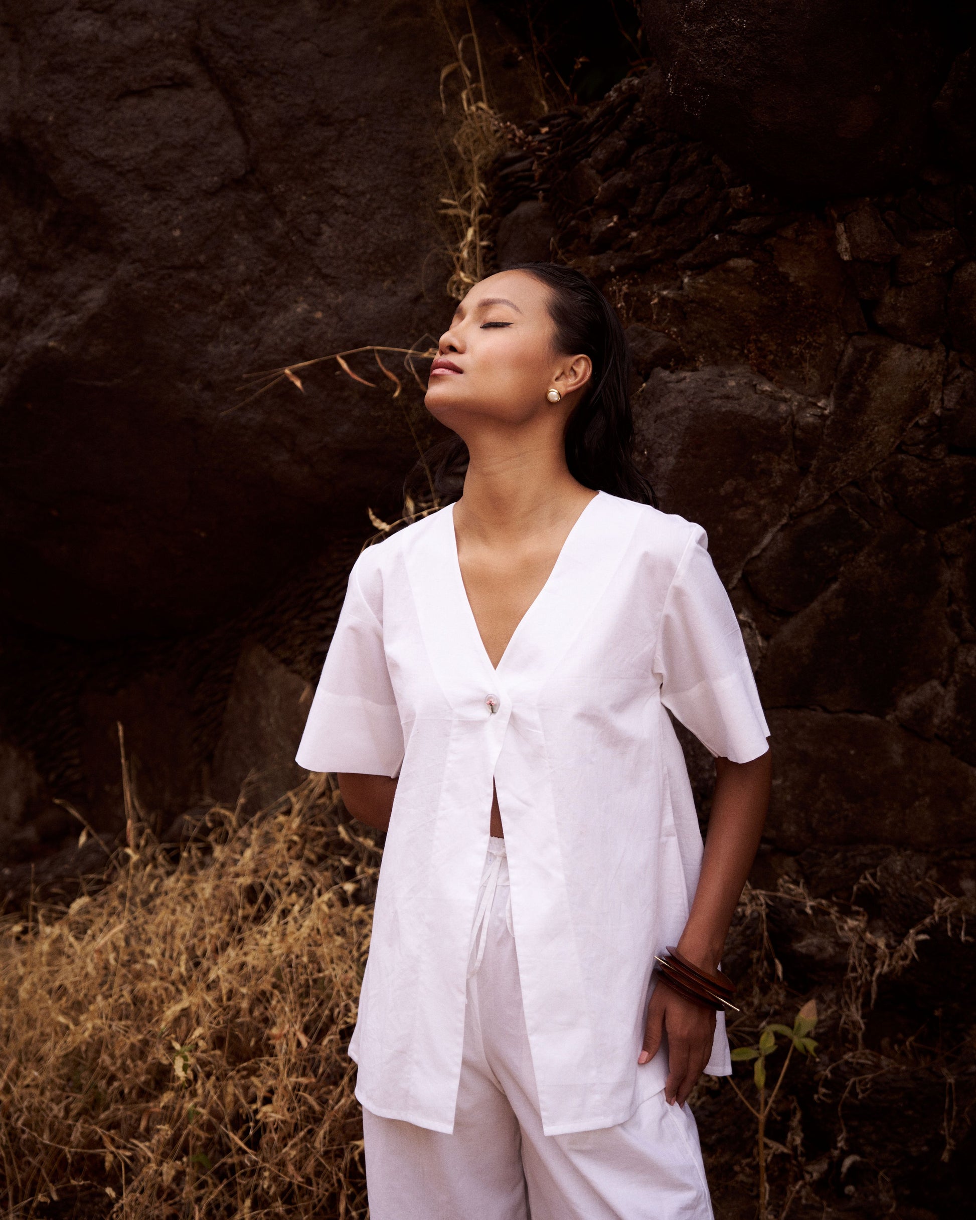The set features an overlay top crafted from crisp white cotton, featuring a clean V-neckline, floral-detailed button closure, and a relaxed fit that flows gently with movement. It pairs effortlessly with the mini skirt, cut from soft white cotton and accented with a single welt pocket, blush-toned stitching, and a shell button—a quiet nod to natural textures and subtle elegance. Together, they create a look that’s light, playful, and endlessly versatile.